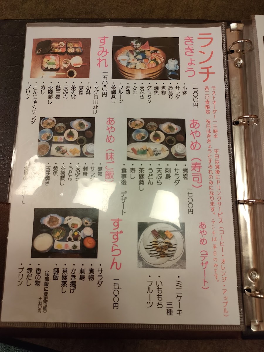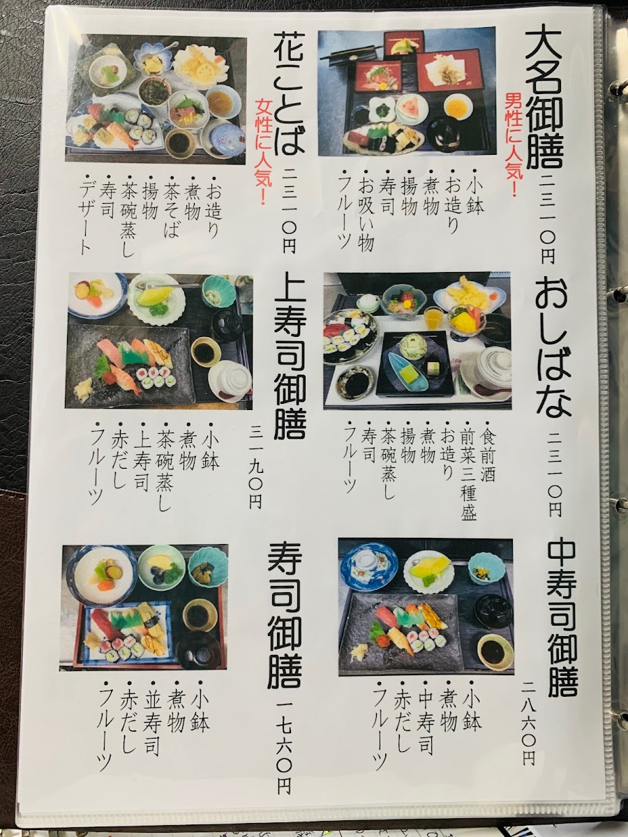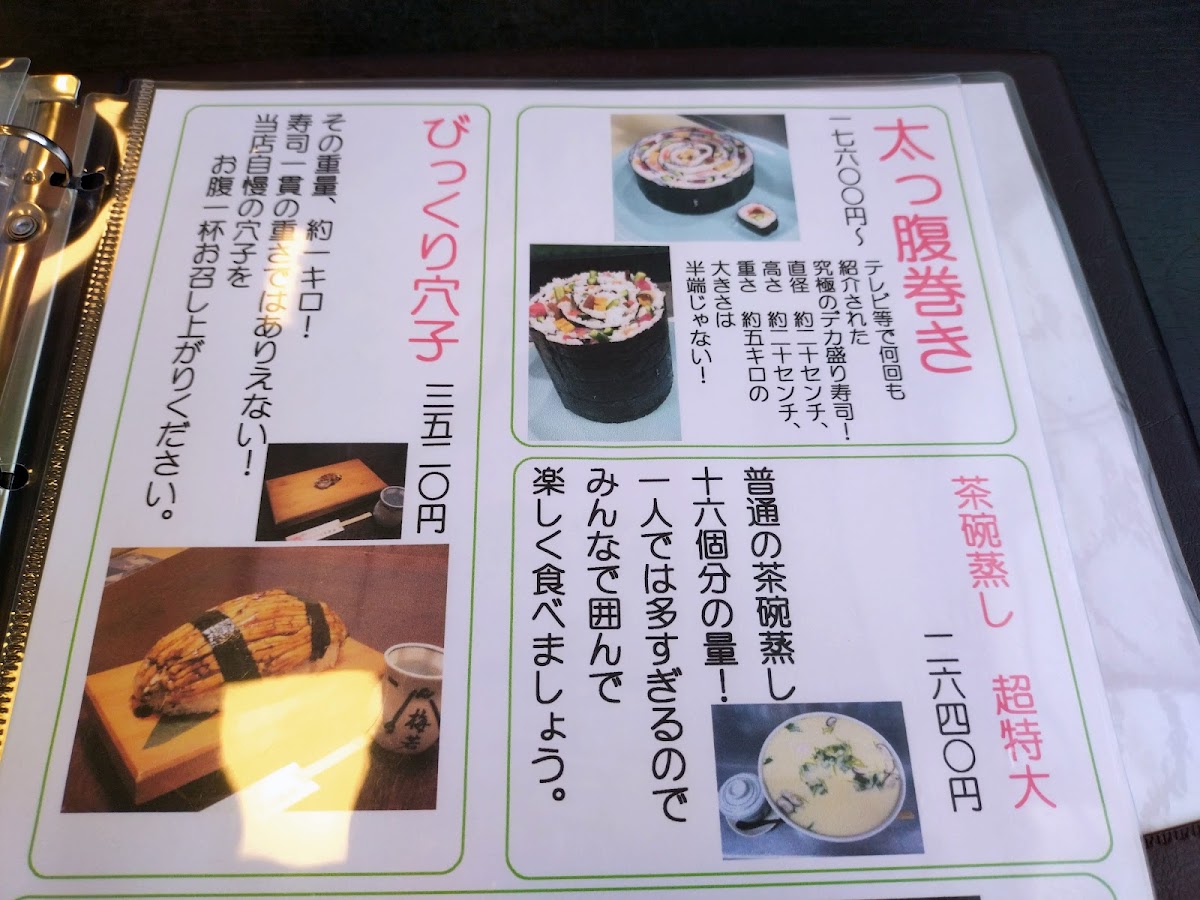 The 大名御膳 (Daimyo Gozen) is a premium set meal that perfectly balances a variety of flavors, from sashimi to tempura, providing an indulgent experience. For something more substantial, the 超太巻き (Super Thick Roll) offers a hearty sushi roll that satisfies even the biggest appetites. If you're in for a lighter, more casual option, the お昼ランチ ききょう (Lunch Set Kikyo) is an ideal choice, offering a well-rounded meal perfect for midday.